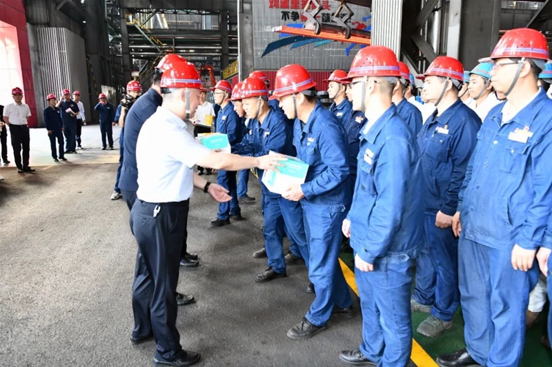 在龍鋼公司煉鋼新區(qū)連鑄高溫生產(chǎn)現(xiàn)場(chǎng),領(lǐng)導(dǎo)們與職工們一一握手,并將防暑降溫飲品遞到他們手中,叮囑職工們做好暑期防護(hù)。