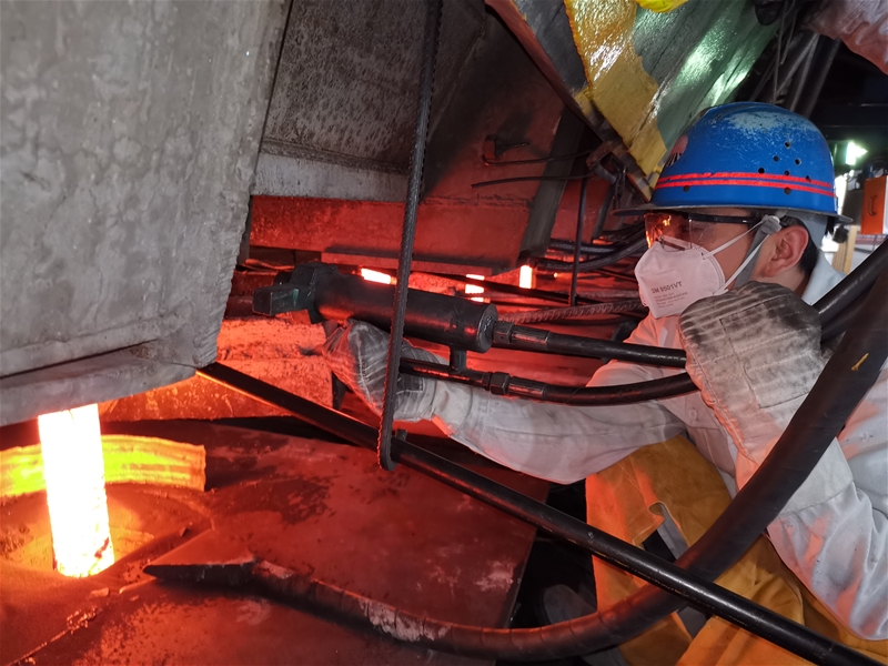 四流開澆、五流開澆、三流開澆……中包工們按照先中間后兩邊的原則,緊張而有序地將八個流順利開澆。澆鋼區(qū)內(nèi)溫度驟然升高,白色的蒸汽縈繞在中包工們的腳下,仿若騰云駕霧一般。拉矯機處,另一群中包工早已等候多時,看著紅坯緩緩穿過拉矯機,他們拿起撬杠、割槍對著坯頭又撬又割,并在最短時間內(nèi)保證紅坯順利前行。臺下輥道處,紅坯剛剛經(jīng)過火切機,拉矯剪切工就拿著割槍,對準(zhǔn)黑色的坯頭進行切割,一陣火花過后,他們用天車鏈條將坯頭固定后又指揮天車吊至廢鋼斗……在眾人的一番努力后,八個流的紅坯順著輥道緩緩前行。