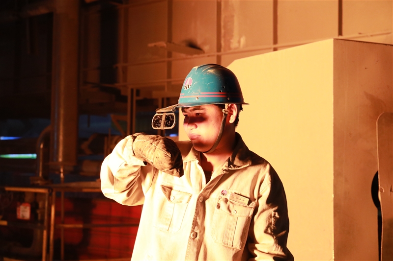 8點30分,6#轉(zhuǎn)爐操作室內(nèi),姚永青正全神貫注地扳動操縱桿,室外的轉(zhuǎn)爐緩緩轉(zhuǎn)動。頓時,一股灼人的熱浪逼來,轉(zhuǎn)爐張開“火”盆大口,內(nèi)壁像巖漿表面隨時能噴出火來。刺眼的紅光逼得人睜不開眼睛,姚永青卻專注地盯著火紅的爐膛,認(rèn)真地觀察爐況。一眨眼的功夫,姚永青已經(jīng)沖到了爐前。再回來時,他的汗正順著頭發(fā)往下滴,衣服已經(jīng)被汗水浸透。據(jù)了解,這樣的工作,他每天要重復(fù)十幾次。