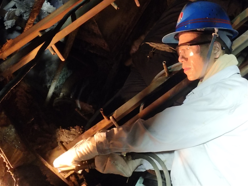 在4#連鑄機二冷室里,第堅強正埋頭忙碌著,尾坯剛剛拉過二冷室,等不及溫度降下來,他拿著扳手、割槍,鉆進狹小的二冷室里干活,噴淋管上不時有水滴落下,他在水滴與汗滴下與時間賽跑。從一流到八流,從一段到三段,“滋滋”的聲響伴隨著鋼花飛舞。這一進去便是半小時,等他出來后,全身的工作服都濕透了,汗水順著衣角流到了地上,而他全然不顧,又忙著去切冷鋼。