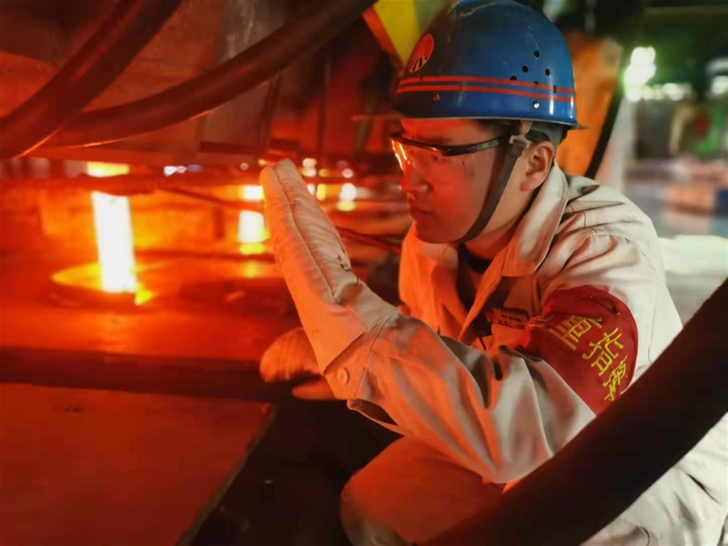 走進(jìn)澆鋼區(qū),一股熱浪迅速將人包裹起來。八個鋼流在火紅的套管中穿過,平穩(wěn)有序。一名中包工手里握著小鏟子,徘徊在八個流之間,仔細(xì)觀察著每個流次的澆注情況,時不時地將保護(hù)渣加入結(jié)晶器內(nèi);另一名中包工拿著工具半蹲在七流前,準(zhǔn)備將到期的中包套管卸下。“快、快、快”,一名穿著防護(hù)服的中包工提著烤得發(fā)紅的中包套管快速向七流奔去。就在這時,舊套管快速卸下,新套管立即戴上,瞬間鋼花四濺、璀璨奪目。自實施全保護(hù)澆注以來,他們嚴(yán)格按照中包套管使用時間進(jìn)行更換,防止鋼水在澆注過程中氧化,保證鑄坯質(zhì)量100分。