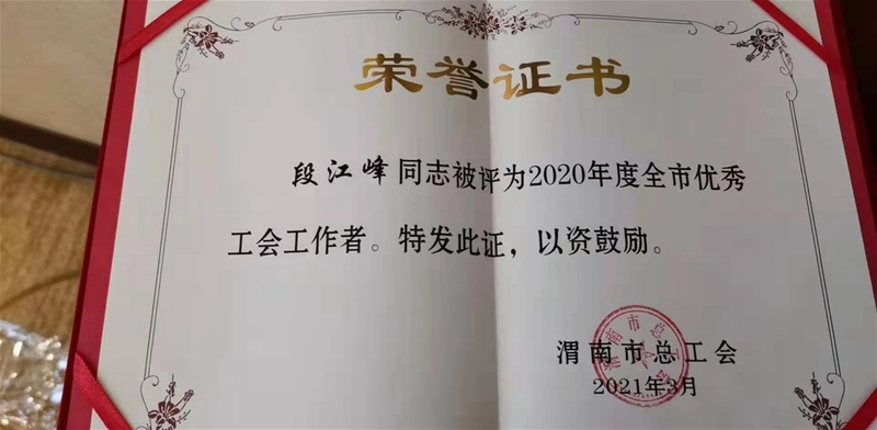 3月16日,在渭南市總工會二屆十四次全委(擴大)會上,龍鋼公司工會工作榮獲市總工會多項榮譽,并現(xiàn)場受到了表彰。龍鋼公司工會榮獲“工會在您身邊竭誠為您服務(wù)”主題活動創(chuàng)新服務(wù)一等獎和“基層示范點”榮譽稱號,段江峰榮獲2020年度全市優(yōu)秀工會工作者。