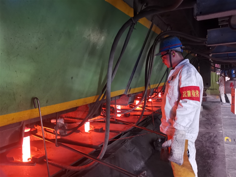 “快,四流紅坯未割斷…”推鋼工通過(guò)對(duì)講機(jī)著急地向臺(tái)下人員反饋信息。接到通知,臺(tái)下組長(zhǎng)陳成林戴上手套,一把抓起割槍,邁開步子沖向四流準(zhǔn)備手工切割,另一名拉矯剪切工一邊開乙炔,一邊托起氧帶緊跟其后。找準(zhǔn)位置站穩(wěn)后,其它幾個(gè)流的紅坯像是一條條火龍,從他們身旁穿梭而過(guò)。陳成林強(qiáng)忍著紅坯的炙烤、咬緊牙關(guān),左手半遮著臉,右手緊握割槍對(duì)準(zhǔn)切割位置,伴隨著切割的“滋滋”聲,紅坯一分為二,他們的臉龐被烤得紅彤彤的,白色的阻燃服也烤得有些發(fā)黃。顧不上喝一口水,他們又趕緊跑去處理火焰切割機(jī)故障。拉矯剪切工們不僅要保證鋼坯的順利出坯,而且每小時(shí)都要跨過(guò)頂著近百度的高溫測(cè)量一次定尺,保證鑄坯的定尺合格率達(dá)到100%。
