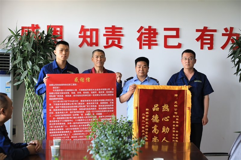 5月27日,同興公司協(xié)作單位韓城市新雙木冶金技術(shù)有限公司負(fù)責(zé)人,將一面寫有“熱心助人 品德高尚”的錦旗以及一封感謝信送到公司,對公司軋鋼廠職工賀創(chuàng)波等三人和保衛(wèi)部職工馮軍鋒等六人表示感謝,感謝他們在關(guān)鍵時刻見義勇為,對外協(xié)單位職工魚偉施以援手的救命之恩和感激之情。
