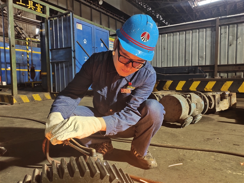 “幫忙拉一下線,我再往切前輥道那里挪一下……”為了能盡快配合完成檢修任務(wù),田凱已顧不上擦拭臉上的汗水,他一只手握著焊槍,一只手舉著面罩,認(rèn)真地焊接著切前輥道處的輪轂,此時(shí)濺起的焊花將他胸前的黨徽照得更加光亮。
