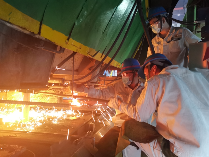 炎炎夏日,持續(xù)的高溫天氣如猛獸一般吞噬著大地,在煉鋼廠連二作業(yè)區(qū)生產(chǎn)現(xiàn)場(chǎng),“炙烤模式”全線開啟,回轉(zhuǎn)臺(tái)上、澆鋼區(qū)內(nèi)、輥道兩旁……在火熱的生產(chǎn)一線,隨處可見煉鋼人戰(zhàn)高溫、斗酷暑的感人畫面,能時(shí)刻感受到鋼鐵人如火的激情和沖天的干勁。