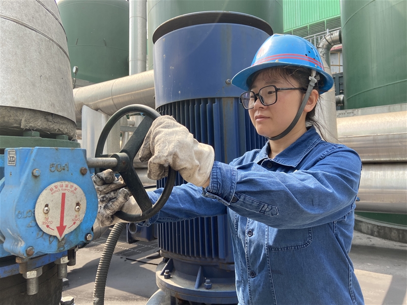圖二:驕陽(yáng)如火般綻放,水泵工王兵開(kāi)啟棒二濁環(huán)增壓泵進(jìn)口閥門,她白皙的臉龐被曬得通紅,即便如此,她仍然以女工特有的耐心與堅(jiān)韌,守護(hù)著水系統(tǒng)的平穩(wěn)順行。