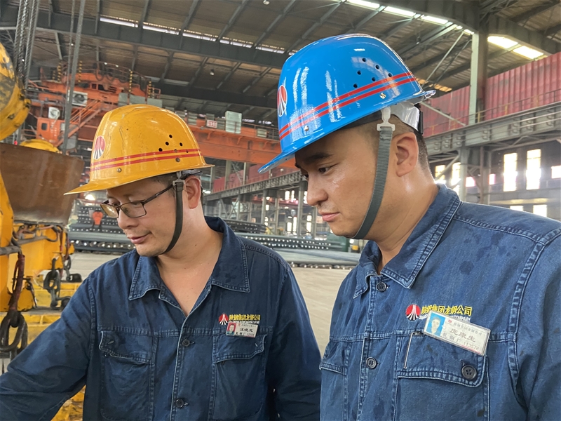 圖五:棒二成品廠房?jī)?nèi),技術(shù)員汪曉龍與鉗工工長(zhǎng)龐康生正在進(jìn)行行車扁擔(dān)梁改造后的效果驗(yàn)證,他們用專業(yè)知識(shí)解決了一次次生產(chǎn)難題、破解了一個(gè)個(gè)技術(shù)瓶頸,為節(jié)能增效軋制貢獻(xiàn)力量。