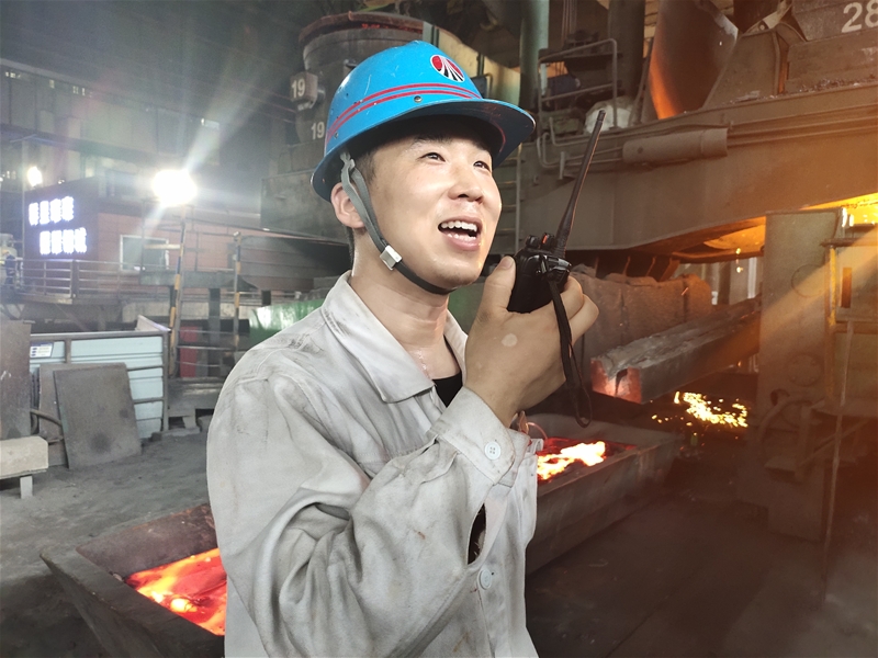 圖五:煉鋼廠轉(zhuǎn)爐作業(yè)區(qū)5#轉(zhuǎn)爐爐長程善煒穿著厚實的阻燃服,在爐后觀察出鋼角度,汗水順著額頭流下,他絲毫不顧,兩眼緊盯出鋼口?;鸺t的鋼水就是他那顆火熱的愛崗敬業(yè)之心。