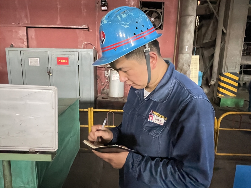 圖九:煉鋼廠天車作業(yè)區(qū)天車工李鋒博在記錄設(shè)備運行情況,他所在的出坯垮地面全是1000℃的紅坯,熱量持續(xù)往上方擴散,臉上的汗珠往下滑落,不變的是他對設(shè)備的認(rèn)真負(fù)責(zé)。