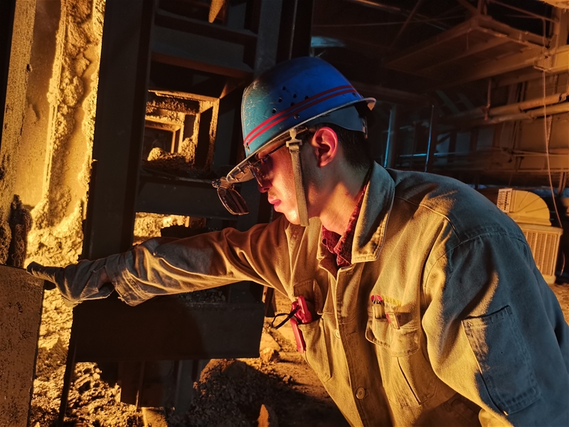 圖二:煉鋼廠連二作業(yè)區(qū)安檢員郭云峰正在對拉矯系統(tǒng)進(jìn)行檢查,火紅的鋼坯從他的腳邊緩緩穿過,盡管他全身被烤得微疼,但他的眼睛始終聚焦在運轉(zhuǎn)的設(shè)備上,不敢有一絲懈怠。