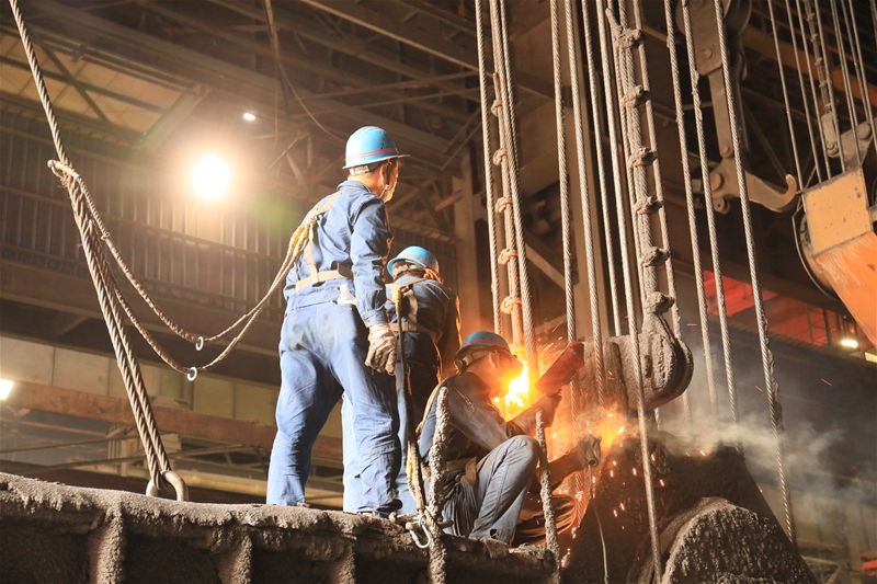 圖十二:煉鋼廠天車作業(yè)區(qū)鉗工盧陳強、郭新民和趙亞龍正在進(jìn)行換繩作業(yè),他們默契又快速地?fù)Q了一根新的鋼絲繩,他們就像這新的鋼絲繩一樣,在高溫環(huán)境里緊緊擰在一起,為生產(chǎn)順行貢獻(xiàn)自己微薄之力。