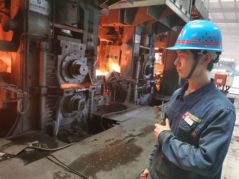 緊張有序地?fù)Q輥?zhàn)鳂I(yè)結(jié)束后,卜丹一邊擦拭汗水一邊喝水,眼睛還時(shí)不時(shí)盯著軋機(jī)的方向,他一口氣喝完杯中的涼開水,走進(jìn)值班室接滿一杯,放下杯子,拿上對(duì)講機(jī),迅速來到軋機(jī)旁,聚精會(huì)神地對(duì)軋制質(zhì)量、設(shè)備等情況進(jìn)行觀察,只見他時(shí)而彎腰用手電查看設(shè)備運(yùn)轉(zhuǎn)情況,時(shí)而站立在軋機(jī)旁仔細(xì)觀察著軋制板型,手中緊握著對(duì)講機(jī),以便及時(shí)向操作臺(tái)反饋信息。在“蒸籠般”的環(huán)境中,即使毛巾都擦拭黃了,衣服能擰出水來,卜丹仍舊穿梭在軋機(jī)之間,只為確保產(chǎn)品質(zhì)量和生產(chǎn)順行。