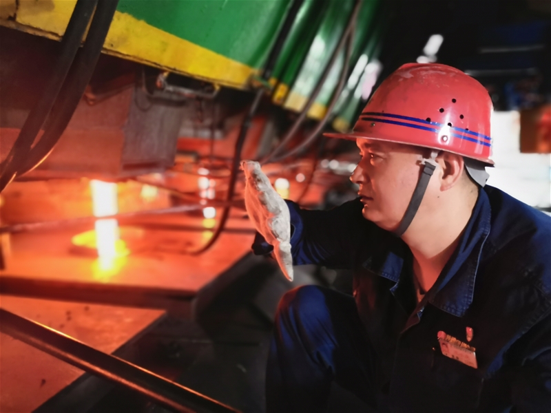 等到大包澆完關包后,臺上組長拿起油缸,沖到鋼流前依次進行堵流作業(yè),中包工們立即回拉速、卸套管。他們各司其職,有的指揮天車退包,有的開中包車,有的鉆進二冷室,有的割尾坯……“快、快、快……”嘈雜的現(xiàn)場聽不清楚他們說話的聲音,唯有一個“快”字,貫穿在換包的始末,讓人聚精會神、迎難而上,他們在鋼花飛舞中上演鋼鐵人特有的“速度與激情”。換包結束后,他們那厚厚的工作服已被汗水浸濕大半。無論春夏秋冬還是嚴寒酷暑,他們始終堅守在這條火熱的戰(zhàn)線上,用滿腔熱血書寫著對鋼鐵的熱愛。