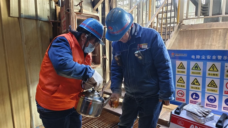 “今日檢修作業(yè)點(diǎn)有電除塵頂部、除塵風(fēng)機(jī)現(xiàn)場(chǎng)、脫硫脫硝灰斗等,后勤保障人員熬制好姜糖水后,按點(diǎn)依次配送……”在晨會(huì)上,該單位安排當(dāng)日后勤保障工作。