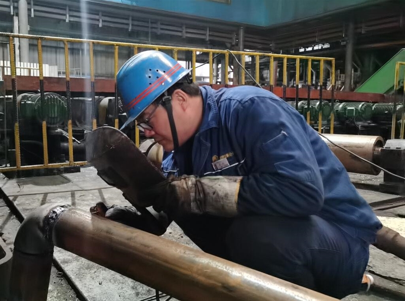 走進(jìn)軋鋼工序板帶作業(yè)區(qū)卷曲下料處檢修現(xiàn)場,鏗鏘敲擊聲、焊花四濺。鉗工馬龍頭戴安全帽,目光如炬,正在焊接下料平臺(tái)架子,周圍的冷空氣360度無死角彌漫,他全然不顧,忙得不亦樂乎。