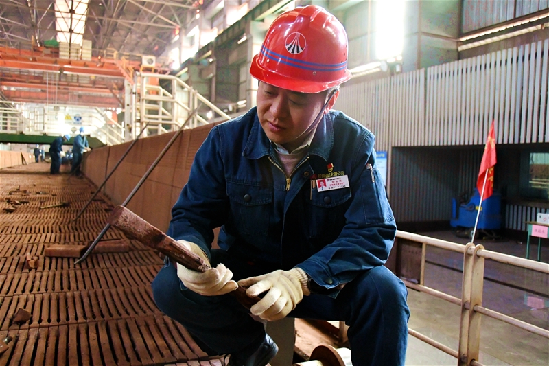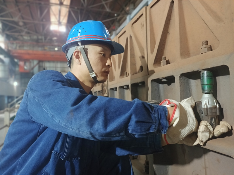 265㎡燒結(jié)機(jī)臺車檢修現(xiàn)場,129塊臺車,每塊臺車上有30個螺栓。3870個螺栓在配料班長王黎的巧手操作中,一個個迅速、精確歸位。一天下來,王黎的胳膊、雙手早已酸痛無比。“只要能夠保證檢修質(zhì)量,自己再苦再累都值得。”他笑著說道。