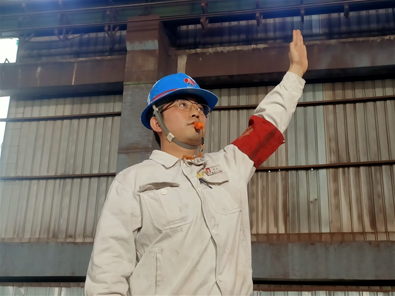 安全監(jiān)護(hù)人員孫立臂戴紅袖章,口含沖鋒哨,在臺車平面的行車下,手勢規(guī)范,指揮幾十噸重的行車,就像一名高空作業(yè)“交警”,全面保障檢修人員安全。