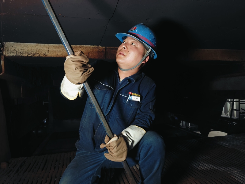 還未完全冷卻的爐膛就像一個大烤爐。賈增武佩戴好煤氣報警器,對爐內(nèi)煤氣濃度進行檢測達標后,拿起制作好的工具,直接進入爐膛內(nèi),找準位置,上下發(fā)力,頑固的結瘤一塊塊被敲落下來。同樣的動作,在不停地反復進行著,看似簡單,其實要消耗大量體力。不一會兒,豆瓣大的汗水順著他的臉頰滴落在尚有余溫的臺車上被瞬間蒸發(fā)……面對高溫他們迎難而上、緊密協(xié)作,最終提前兩個小時完成燒嘴清理工作。