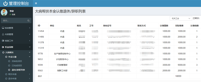 職工大病醫(yī)療幫扶工作是一項(xiàng)長(zhǎng)期性、重復(fù)性、持續(xù)性的工作,龍鋼公司工會(huì)充分利用智慧工會(huì)平臺(tái),制定統(tǒng)一制式表格,在平臺(tái)上完成了入會(huì)職工花名冊(cè)的錄入工作,且以分會(huì)為單位顯示每位員工所繳納的會(huì)費(fèi)和總金額。退休、辭職員工在未享受大病幫扶金的前提下辦理退會(huì)手續(xù)時(shí),登錄智慧工會(huì)平臺(tái)進(jìn)行申請(qǐng),經(jīng)逐級(jí)網(wǎng)上審核、審批后,申請(qǐng)人員名單和信息將由大病幫扶花名冊(cè)自動(dòng)轉(zhuǎn)入退休或辭職人員名單列表,實(shí)現(xiàn)了分類匯總,并顯示退會(huì)人員花名冊(cè)臺(tái)賬、退會(huì)時(shí)間、人次和總金額等信息。