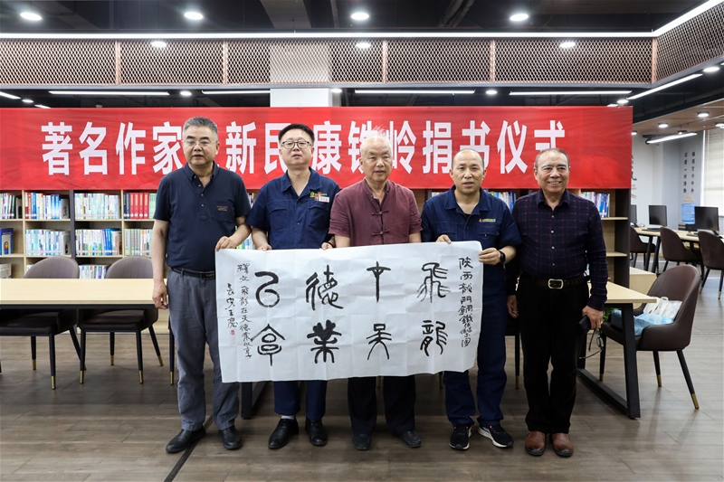 儀式上,王新民為公司捐贈(zèng)了散文集《行余集》《賈平凹紀(jì)事》《春華秋實(shí)》等文學(xué)作品10冊(cè),康鐵嶺捐贈(zèng)了長(zhǎng)篇小說(shuō)《書(shū)院門(mén)1991》4套。同時(shí),王慶捐贈(zèng)了《飛龍?jiān)谔?德業(yè)以享》書(shū)法作品。