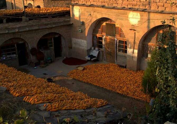 冬日的陜北,山脈連綿寂寥,可裊裊炊煙卻為這廣闊天地添了幾分色彩。天還麻麻亮的時候,陜北的婆姨就開始忙了,堿坂上的碾轱轆悠哉悠哉的轉(zhuǎn)著。拉碾子的驢走走停停,時而偷吃一嘴玉米面,婆姨罵罵咧咧道:“你這個老家禽,給你喂時你不餡,正讓你干活你就餡歡了,噔俅。”跟著母親的孩子,懷中抱著柴草,燃燒在磨盤旁邊,給母親足夠的亮光。“日上三竿”,人們才懶洋洋的出了窯洞,太陽暖烘烘的照到堿坂上那幾根椽上時,那里就開始熱鬧了。吃過飯的人們來到這里,圪蹴在椽上曬太陽,偶爾有一兩家飯做得遲的,會端上美美一老碗黃米撈飯,來趕個場,也圪蹴下問旁邊的人:“你們吃蘭?。繘]吃家里多得是,可道我家舀去。”眾人發(fā)出:“你就不會把盆端出來?小氣死啦、光顧你一個人吃哩、端一碗夠誰吃?你也太不實在了……”端飯的人嘿嘿一笑,嘶溜嘶溜的吃起自己的飯。