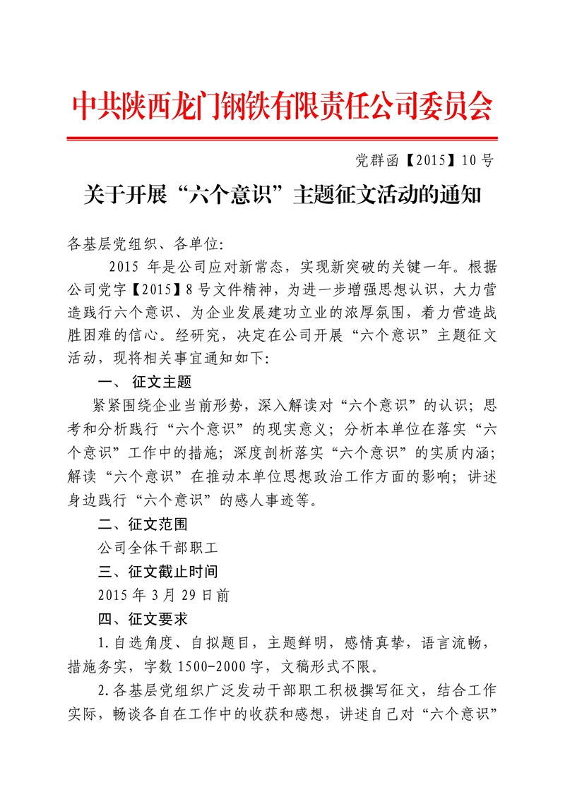 中共陜西龍門鋼鐵有限責任公司委員會 關于深入開展“六個意識”思想教育活動的通知
