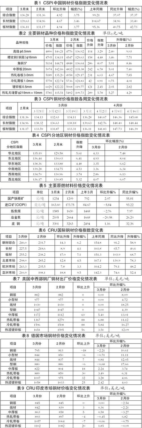 3月末,CSPI長材指數(shù)為139.63點(diǎn),環(huán)比上升4.67點(diǎn),升幅為3.46%;CSPI板材指數(shù)為136.11點(diǎn),環(huán)比上升4.94點(diǎn),升幅為3.77%,比長材升幅高0.31個(gè)百分點(diǎn);與去年同期相比,長材指數(shù)上升34.96點(diǎn),升幅為33.40%;板材指數(shù)上升40.75點(diǎn),升幅為42.73%。(見圖2、表1)