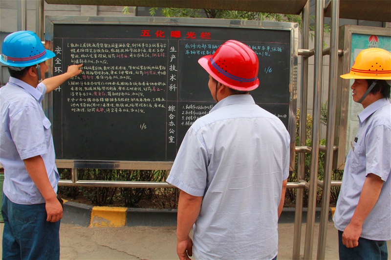 為了更醒目的展現(xiàn)對違章事實(shí)、所在單位、所屬專業(yè)和管理人員的處罰,從視覺上提高各級人員對“五化”曝光問題的關(guān)注度,有效杜絕同類問題的重復(fù)出現(xiàn)。近期,設(shè)備管理中心對五化曝光欄進(jìn)行了劃線、標(biāo)識,分區(qū)域、分專業(yè)用粉筆的不同顏色對問題進(jìn)行曝光,突出違章人員姓名和違章考核結(jié)果,充分運(yùn)用色彩管理將管理者的“面子”、“票子”曝光。